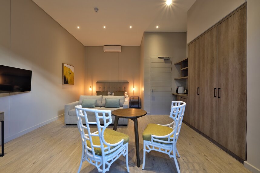 Das Hotel besitzt 14 Zimmer, welche mit Klimaanlage, Safe, Sofa und einem Schreibtisch ausgestattet sind. Es gibt Zimmer mit Meer- oder Bergblick, eine außergewöhnlich gestaltete Garten-Suite und die Lookout Suite mit Blick auf Robben Island. Die höher gelegenen Superior Sea View Zimmer bieten einen spektakulären Blick über Green Point bis hin zur Waterfront aufs Meer. Der kleine Garten mit Pool lädt nach vielen Unternehmungen zum Relaxen ein. Darüber hinaus stehen Annehmlichkeiten wie ein Sonnendeck, ein Businesscenter, ein Spa & Wellnesscenter und eine Bar mit Lounge für die Gäste im The Tree House Boutique Hotel zur Verfügung. Jeden Morgen wird ein à-la-carte Frühstück serviert.