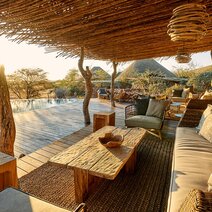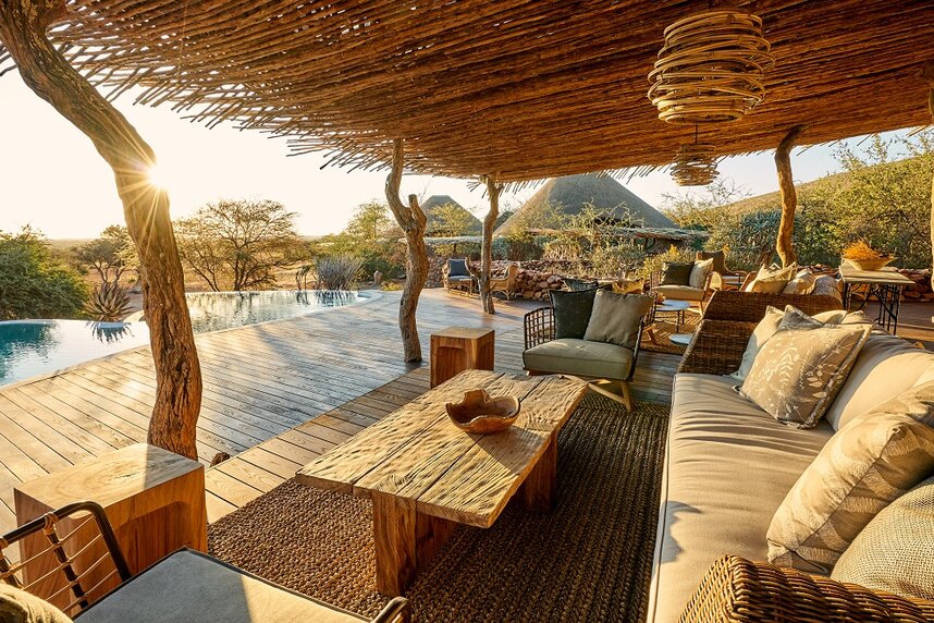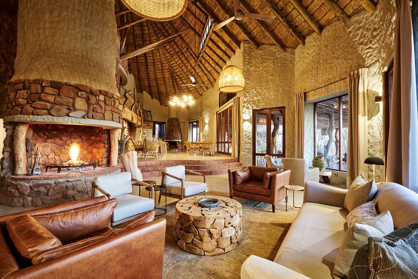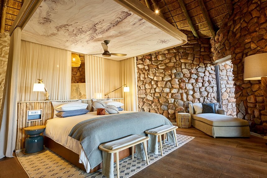 Die neun circa 100 m² großen, reetgedeckten Chalets sind aus Naturstein gebaut und mit viel Liebe zum Detail im afrikanischen Stil eingerichtet. Für Familien gibt es drei größere Suiten (170 m²) mit zwei getrennten Schlafräumen. Alle Suiten verfügen über einen Wohn- und Schlafraum mit Kamin, Badezimmer, Außendusche und ein Sonnendeck mit Blick auf ein Wasserloch.
