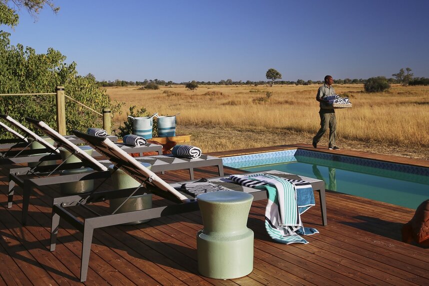 Das Tuludi Camp bietet sieben helle und luftige Zelte mit angenehmer Größe (60 m²) im Baumhausstil. Die einzelnen Zelteinheiten sind mit Holzstegen, die sich durch die Leadwood-Bäume schlängeln mit dem Hauptbereich der Anlage verbunden. Alle Zelte spiegeln mit warmen Erdtönen die umgebene Natur wieder und bieten getrennte Ankleide- und Schlafbereiche, ein eigenes Badezimmer, Innen- und Außenduschen sowie eine Außenveranda mit einem privaten Tauchbecken und einem versenkten Sitzbereich, wo Sie die Aussicht auf die riesigen Überschwemmungsgebiete genießen und den Tag ausklingen lassen können.