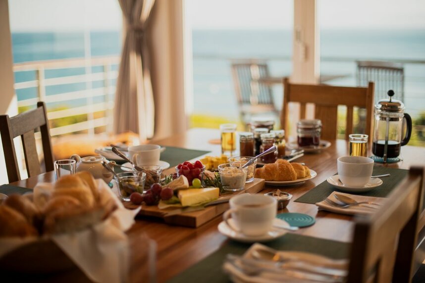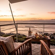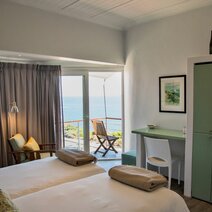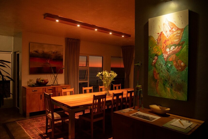Die vier großzügig geschnittenen Standardzimmer verfügen jeweils über einen kleinen Balkon mit eingeschränktem Meerblick. Die Honeymoon Suite hingegen bietet einen spektakulären Blick auf das Meer – direkt vom Bett oder vom eigenen Balkon aus. Alle Zimmer sind stilvoll eingerichtet und mit Badewanne sowie Dusche ausgestattet. An warmen Tagen sorgt der kleine Pool für angenehme Erfrischung. Ein abwechslungsreiches Frühstück mit teils hausgemachten und regionalen Produkten wird im Hauptbereich der Lodge oder auf Wunsch im Zimmer serviert. Genießen Sie die entspannte, persönliche Atmosphäre dieser liebevoll geführten Unterkunft.
