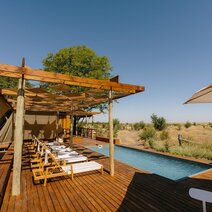 Das bahnbrechende Mokete beherbergt nur 18 Gäste in 9 Zelten. Um eins werden zu können mit der umgebenden Wildnis verzichtete Wilderness Safaris auf feste Wände, stattdessen sind Zeltdächer angebracht die sich zur Seite schieben lassen und den Blick auf den unendlichen Sternenhimmel freigeben. Ob Sie tagsüber einen Drink mit Elefanten teilen oder mitten in der Nach den Rufen der Hyänen lauschen - in jedem Fall wird Ihr Aufenthalt ein Fest für die Sinne.