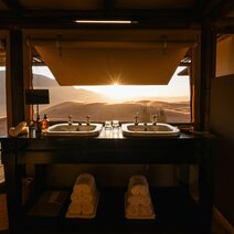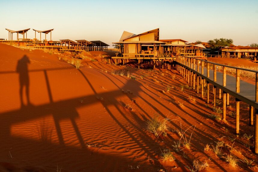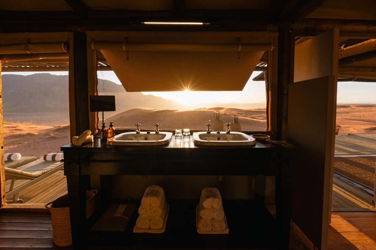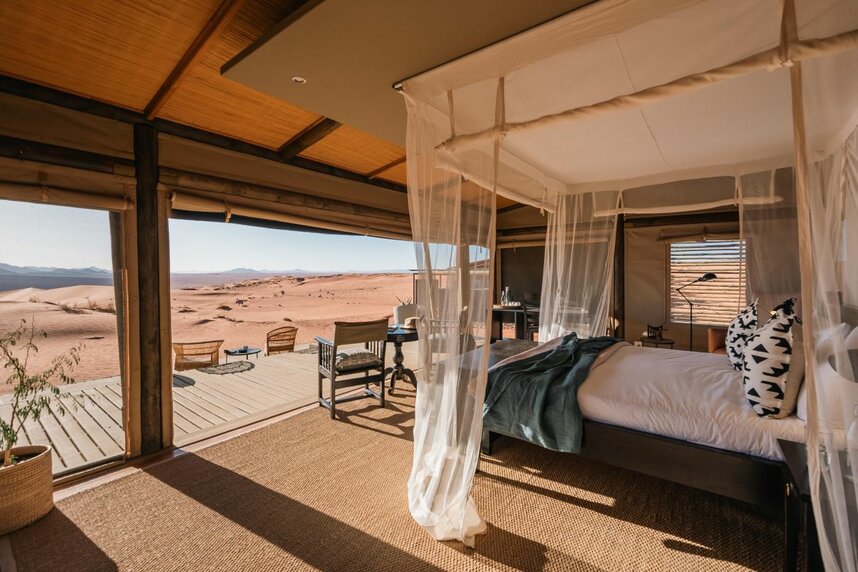Die Lodge verfügt über sechs stilvolle Zeltsuiten und drei geräumigeFamilienzimmer, die aus Holz und Zeltleinwand mit großen Panoramafenstern gestaltet sind. Die Innenräume sind vom Licht und den natürlichen Texturen der Wüste inspiriert und verbinden Komfort mit der charakteristischen Wolwedans-Ästhetik. Alle Unterkünfte verfügen über ein eigenes Bad sowie eine großzügige Aussichtsterrasse mit Blick auf die roten Sanddünen und die fernen Bergketten. Die Beleuchtung erfolgt umweltfreundlich über Solarenergie; ab Juni 2026 sind zudem flexibel umwandelbare Betten (Einzel- oder Kingsize) verfügbar.