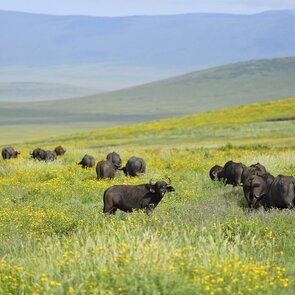 Die Ngorongoro Conservation Area grenzt in ihrer nordwestlichen Ausdehnung an die Serengeti und nördlich an den Ol Doinyo Lengai, den heiligen Gottes-Berg der Massai. Vor Jahrmillionen sankte der gigantische Vulkan in sich zusammen und am Boden der Caldera entstand ein außergewöhnlicher Lebensraum mit weiten Grasebenen, einem Natronsee und üppigen Flussläufen. Hier tummeln sich bis zu 30.000 Wildtiere und man hat das ganze Jahr über außergewöhnlich gute Chancen, die “Big Five“ zu erspähen.