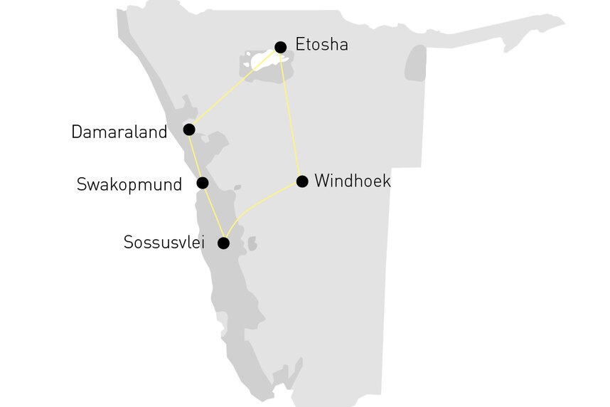 Auf dieser Safari erleben Sie die Naturschönheiten und Nationalparks Namibias in einer kleinen Gruppe (max. 7 Personen), die von einem englischsprachigen Guide begleitet wird. Von den berühmten Dünen des Sossusvlei, durch die Namib Naukluft Wüste zum Atlantik nach Walvis Bay und in das malerische Swakopmund, dann in die herbe Hügellandschaft des Damaralands und am Ende der Reise die faszinierende Tierwelt der Etoscha Pfanne. Die Unterkünfte variieren von einfacheren Zeltcamps mit bequemen Iglu-Zelten (eigene Dusche und WC), einem guten Hotel in Swakopmund und einem größerem Camp in Etoscha. Fast alle Mahlzeiten sind eingeschlossen. Getränke sind extra.