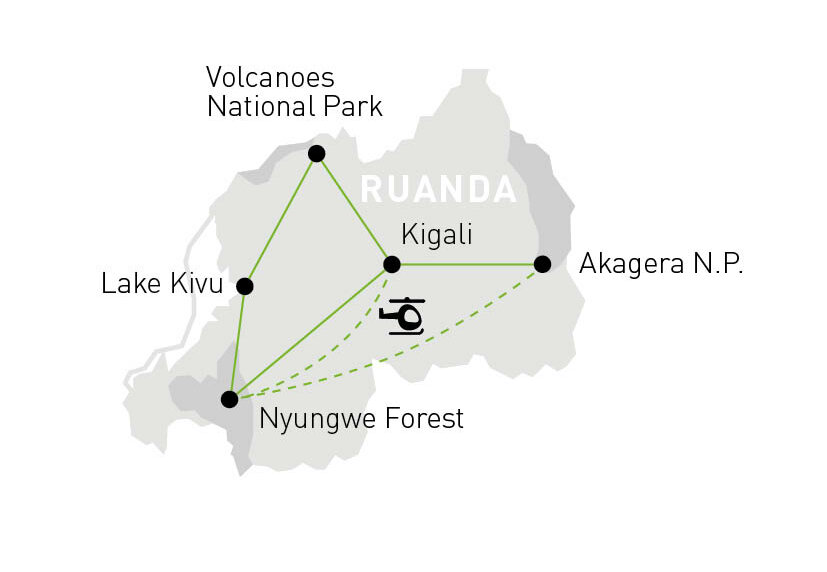Hinweis: Die Reise kann auch um eine Nacht verkürzt werden, indem Sie an Tag 4 von Akagera per Helikopter direkt zum Nyungwe Forest fliegen, somit entfällt die Zwischenübernachtung in Kigali. Bitte kontaktieren Sie uns für ein individuelles Angebot.